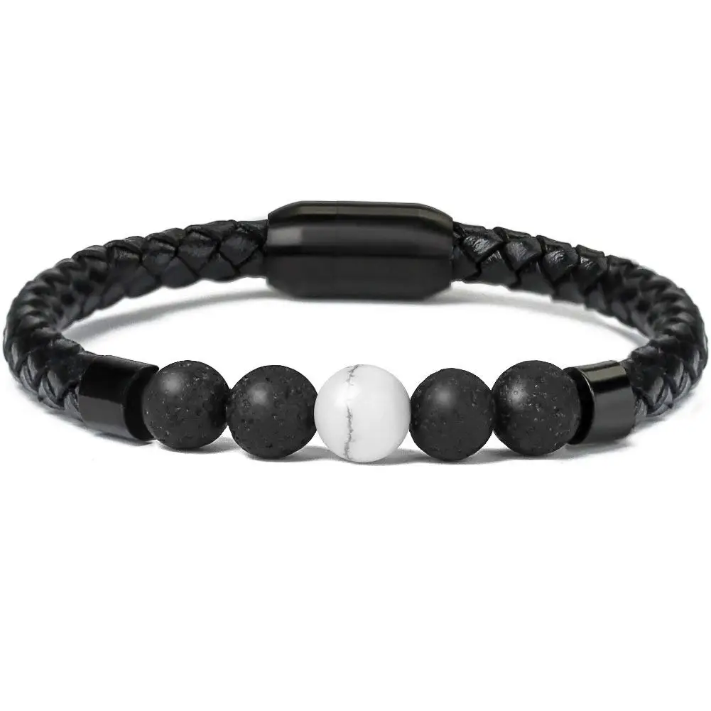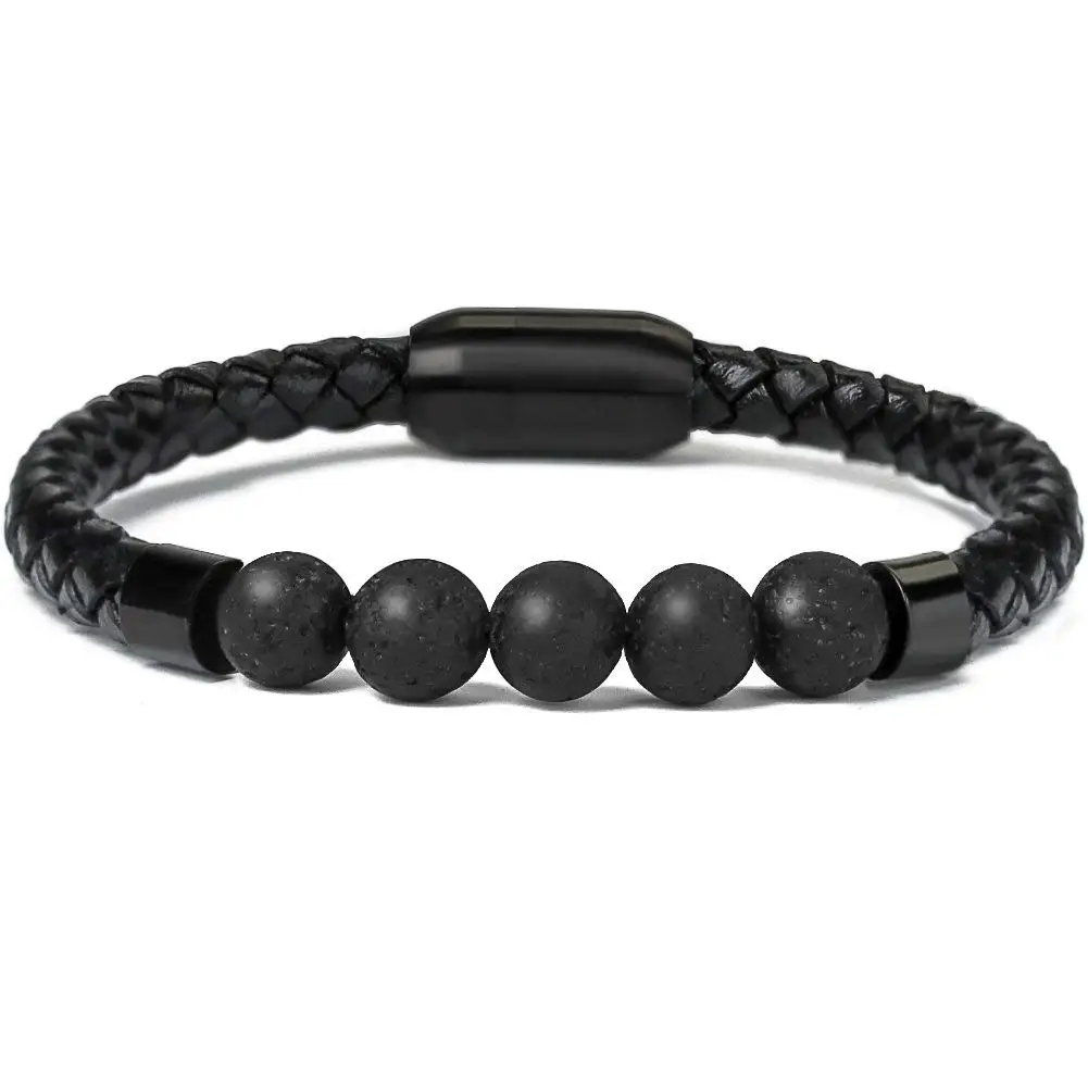 New 2019New Fashion Charm Male Leather Bracelet Lava Chakra Stone Beads Black Stainless Bracelets & Ban