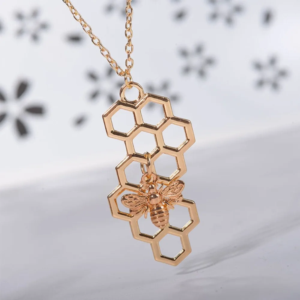 Promo Nature Jewelry Geometric Hexagon Honeycomb Necklace with Bee Charm